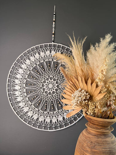 Deze unieke handgemaakte mandala kan gebruikt worden om jouw interieur op te leuken, of om ingezet te worden als dromenvanger.