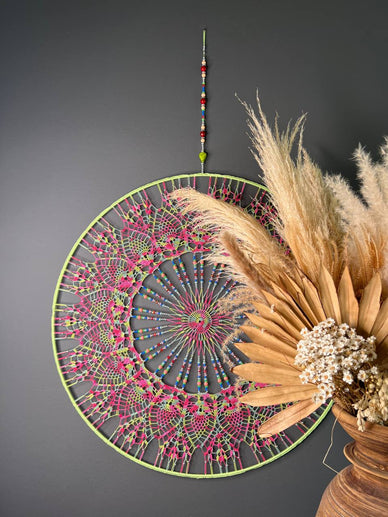 Deze unieke handgemaakte mandala kan gebruikt worden om jouw interieur op te leuken, of om ingezet te worden als dromenvanger.