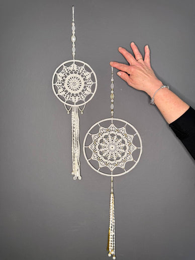 Deze twee mandala’s worden graag samen verkocht, ze horen namelijk bij elkaar. Zoals een tweeling. De prijs is dus ook voor 2 stuks, inclusief ophangkoord.