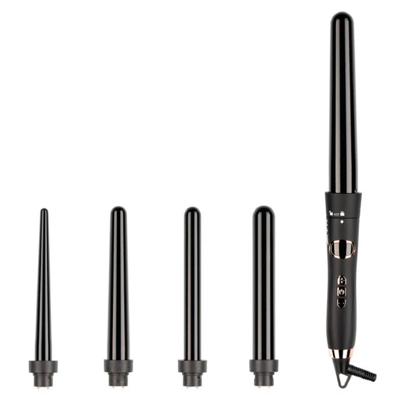 Wat de 5-in-1 krultang uniek maakt is dat de opzetstukken van deze krultang niet zijn voorzien van een kliksysteem maar van een rotatiesysteem. Deze is minder gevoelig, waardoor de kwaliteit van de 5 in 1 ten opzichte van andere complete krultangen ten goede komt. Elke maat ton [keramiek] voorziet het haar van een ander soort krul. Hoe smaller de loop, hoe kleiner de krul. De vaten met een smaller uiteinde zorgen voor een natuurlijke overgang van de krul.