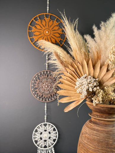 Deze unieke handgemaakte mandala kan gebruikt worden om jouw interieur op te leuken, of om ingezet te worden als dromenvanger.
